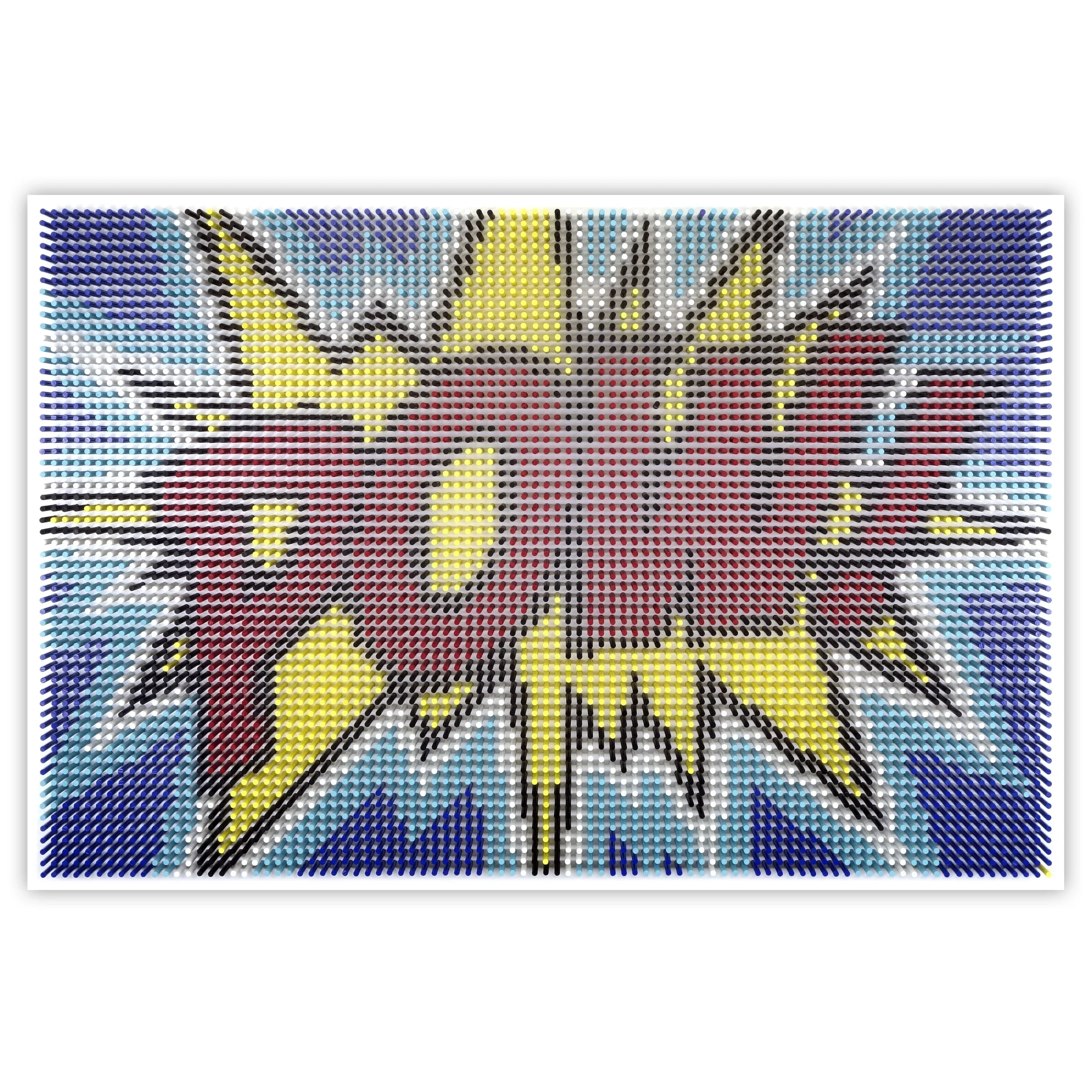 Matt Bilfield creates contemporary geometric wall sculptures composed of thousands of individually painted wooden dowels. These textured sculptural works combine digital precision with handcrafted technique, resulting in dimensional abstract and representational compositions that shift with light and perspective.