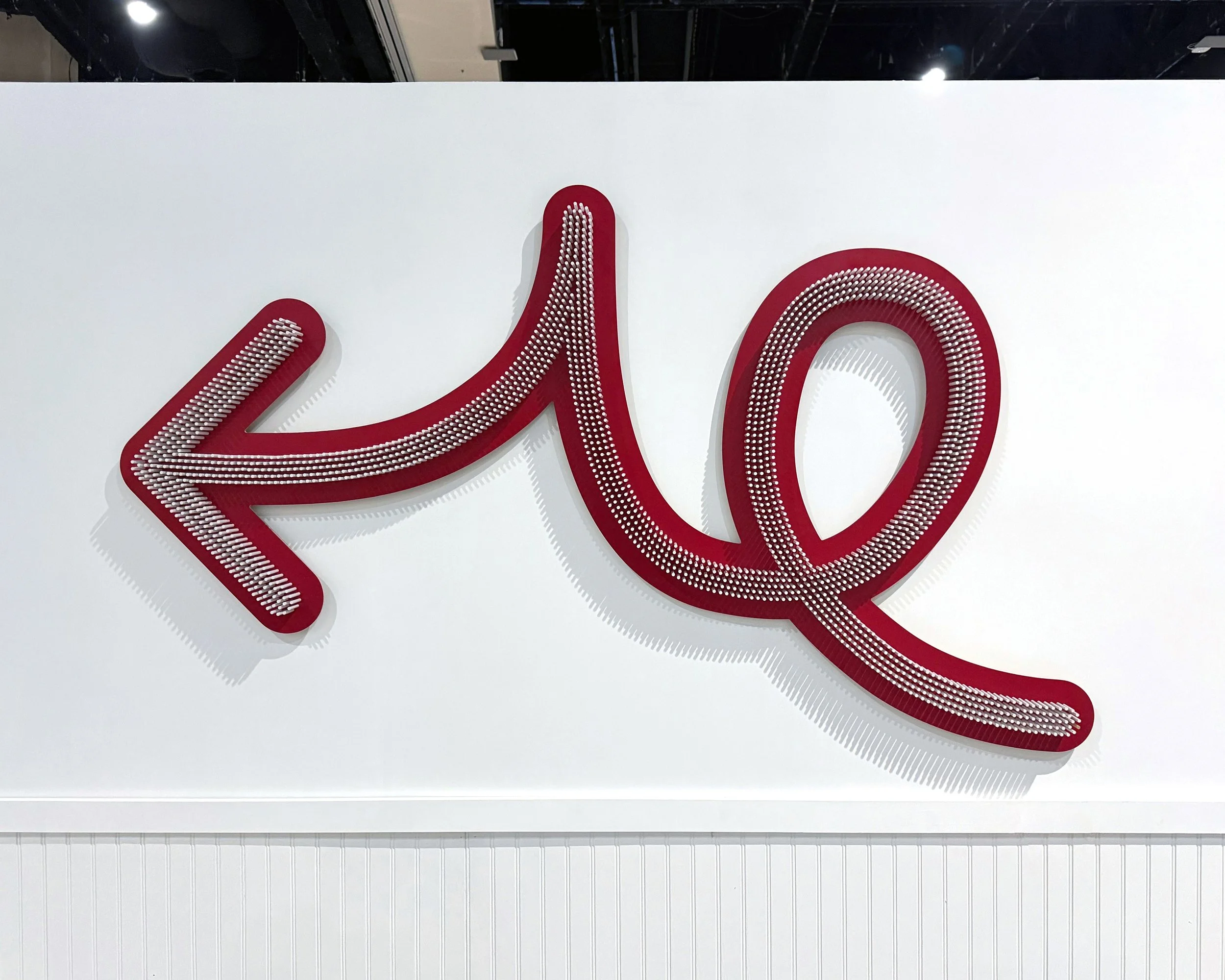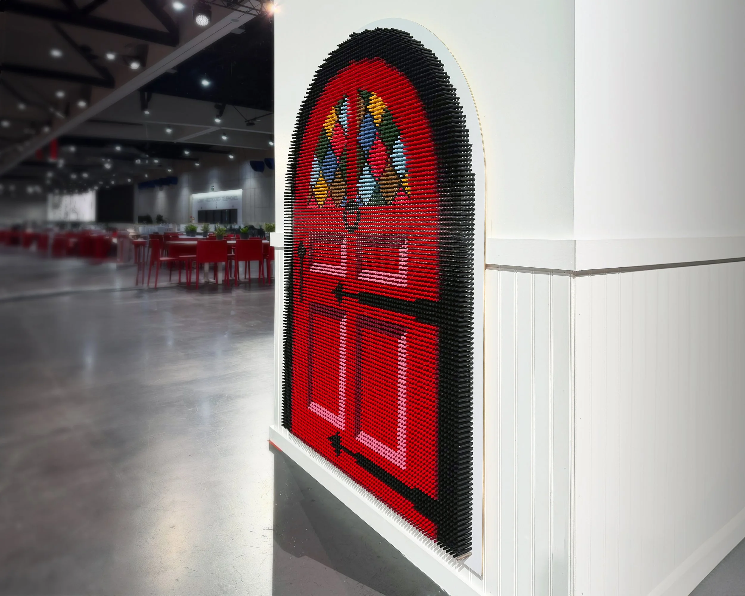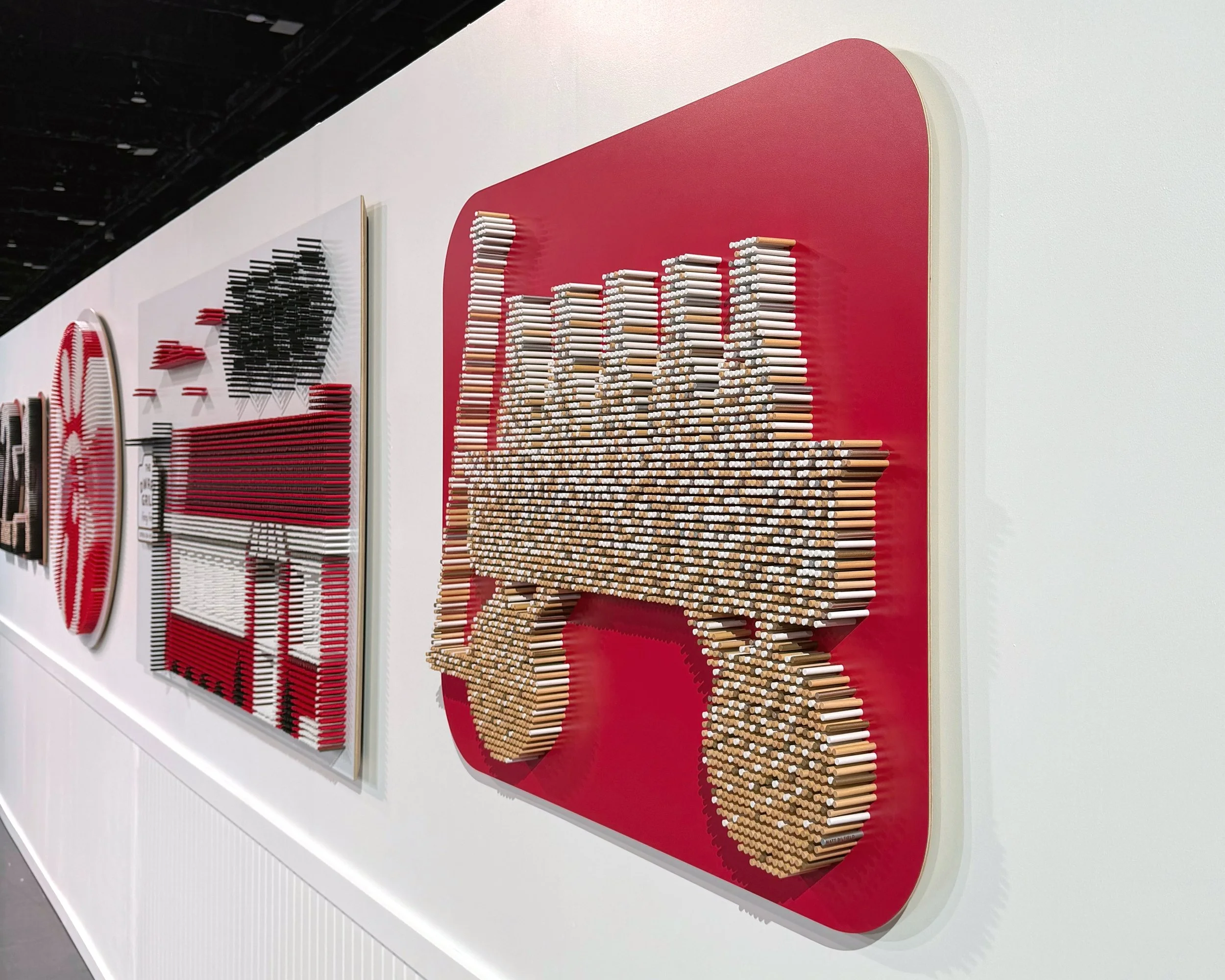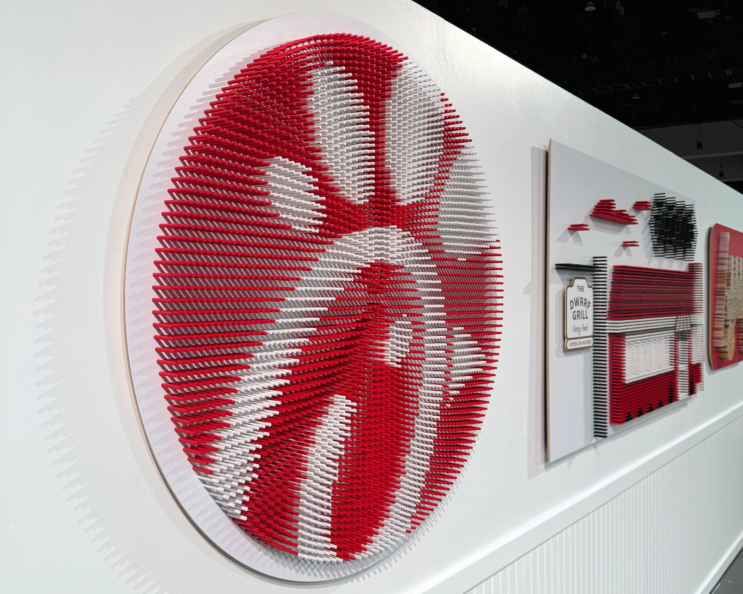 The exhibition comprises eight unique artworks, including a twenty-foot-wide event logo piece. Together, the works are constructed from sixteen individual panels and 49,952 hand-painted wooden dowels. Each dowel functions as a single droplet of paint, placed with precision to build compositions that shift with light and perspective. All red elements were custom color-matched specifically to Chick-fil-A’s brand identity.