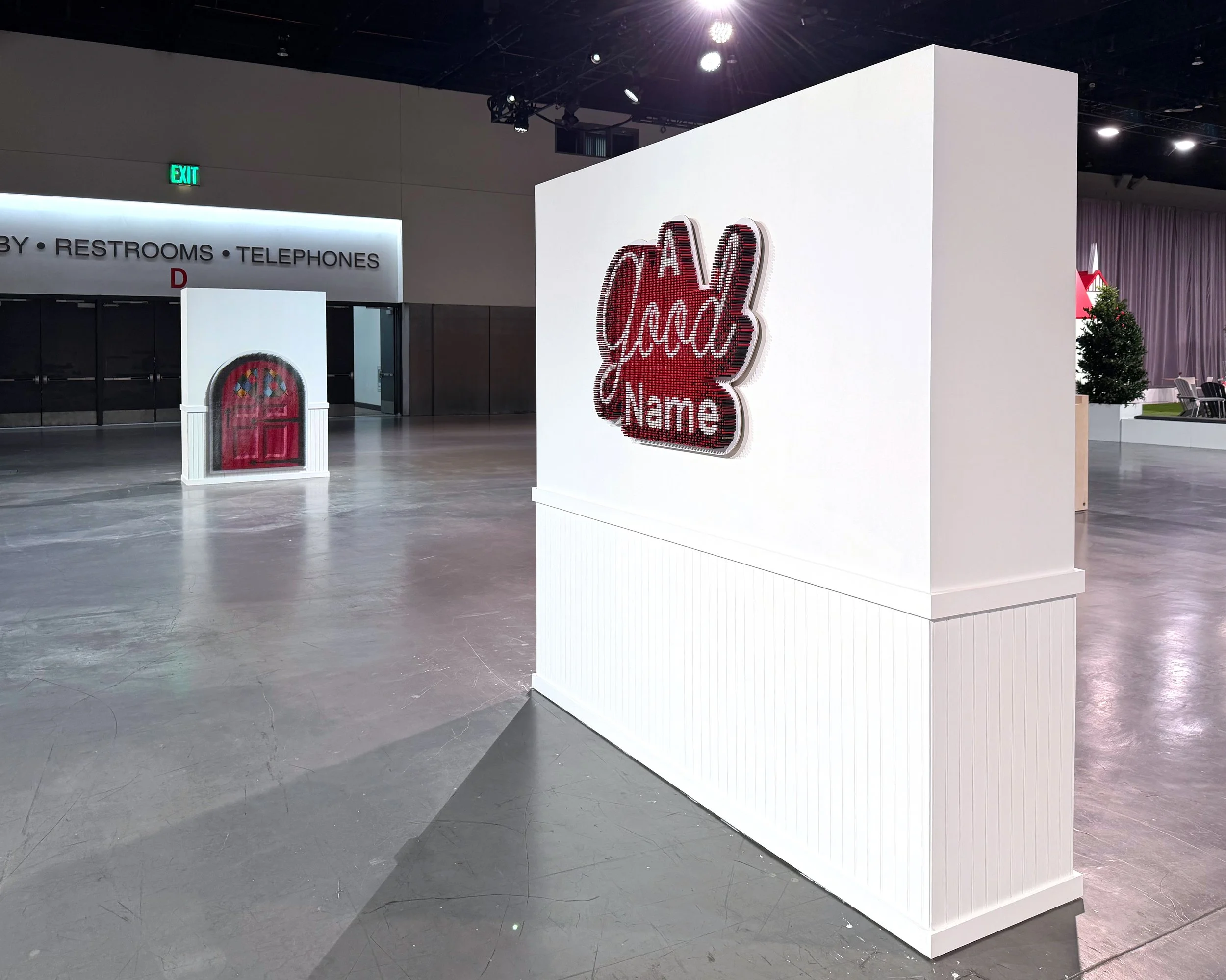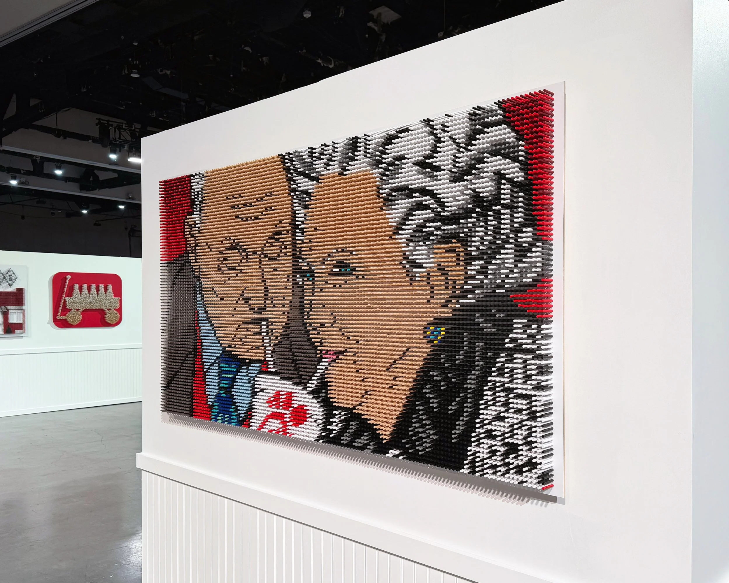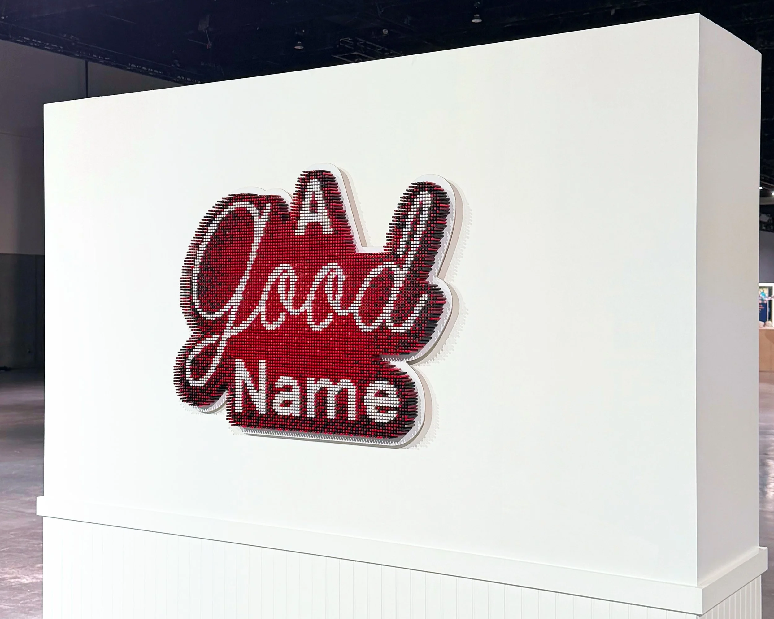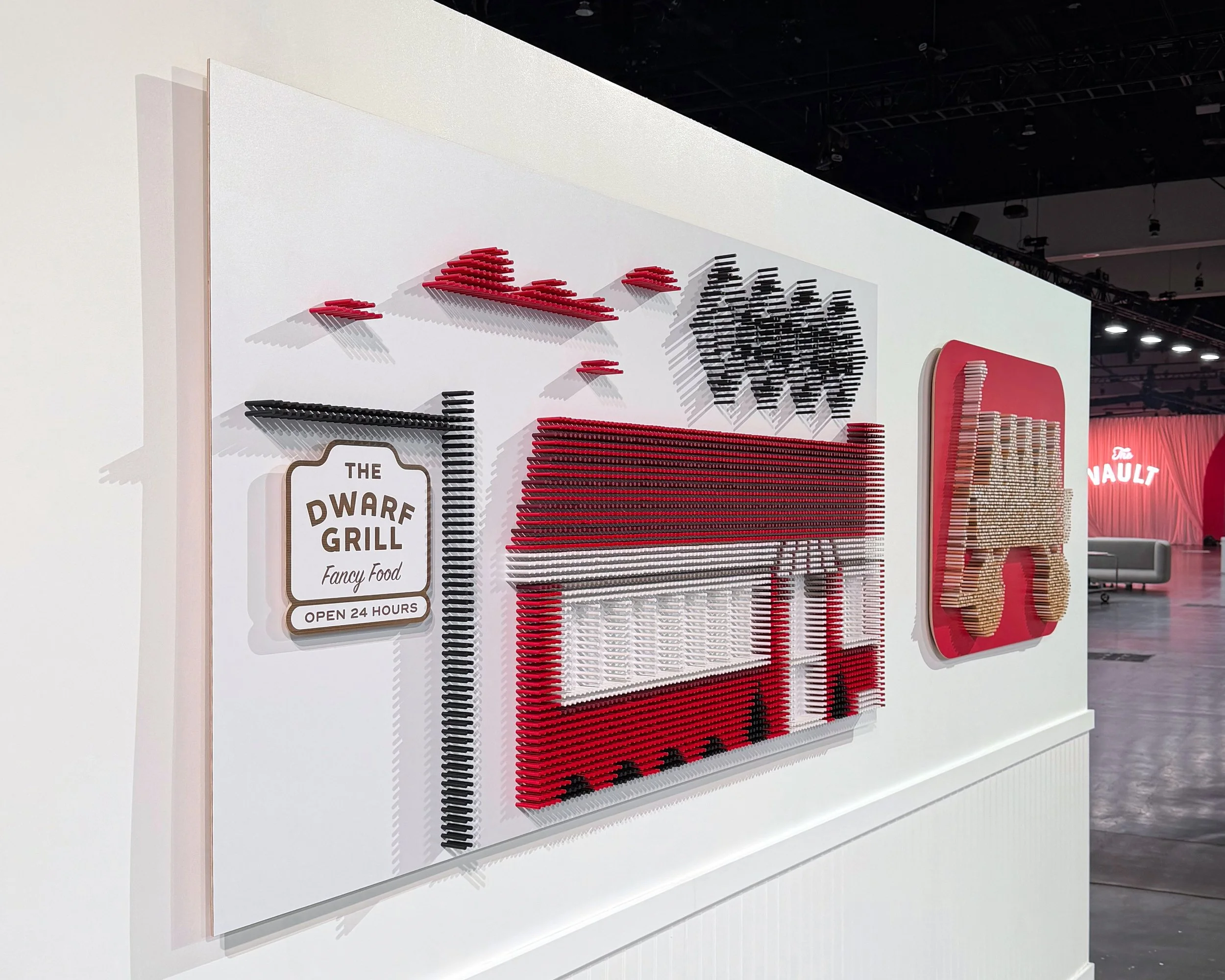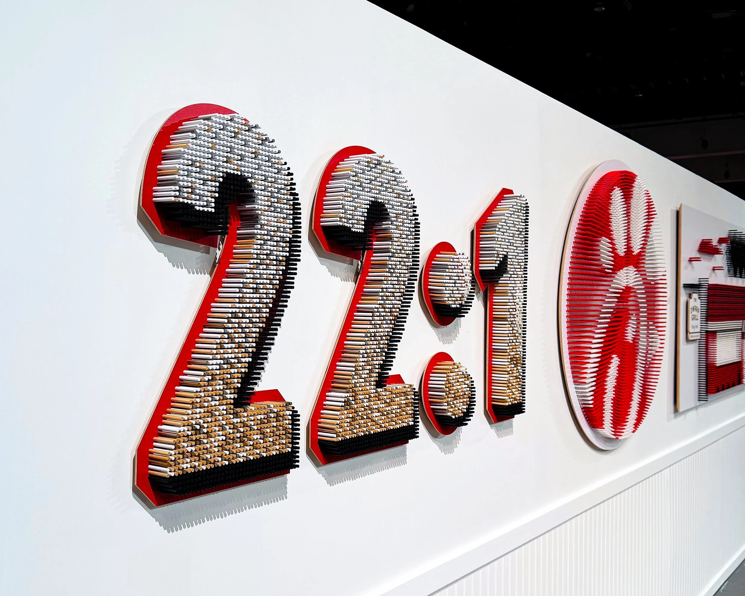 The exhibition comprises eight unique artworks, including a twenty-foot-wide event logo piece. Together, the works are constructed from sixteen individual panels and 49,952 hand-painted wooden dowels. Each dowel functions as a single droplet of paint, placed with precision to build compositions that shift with light and perspective. All red elements were custom color-matched specifically to Chick-fil-A’s brand identity.