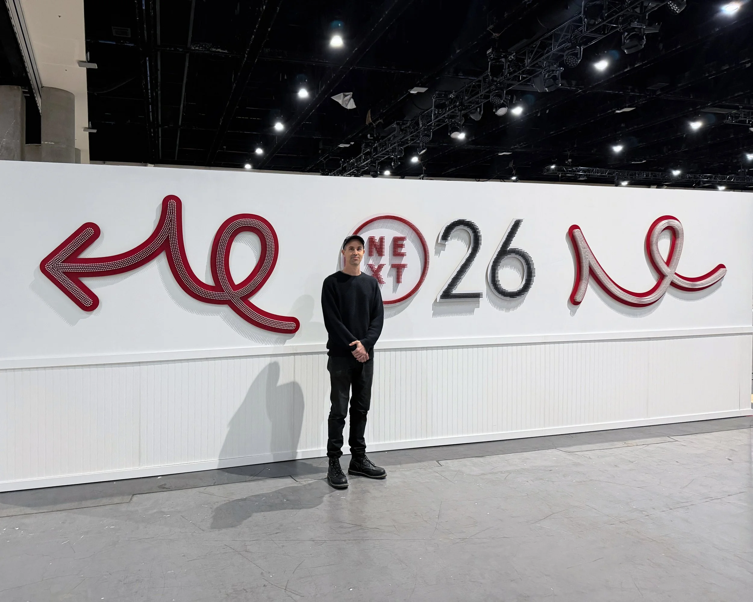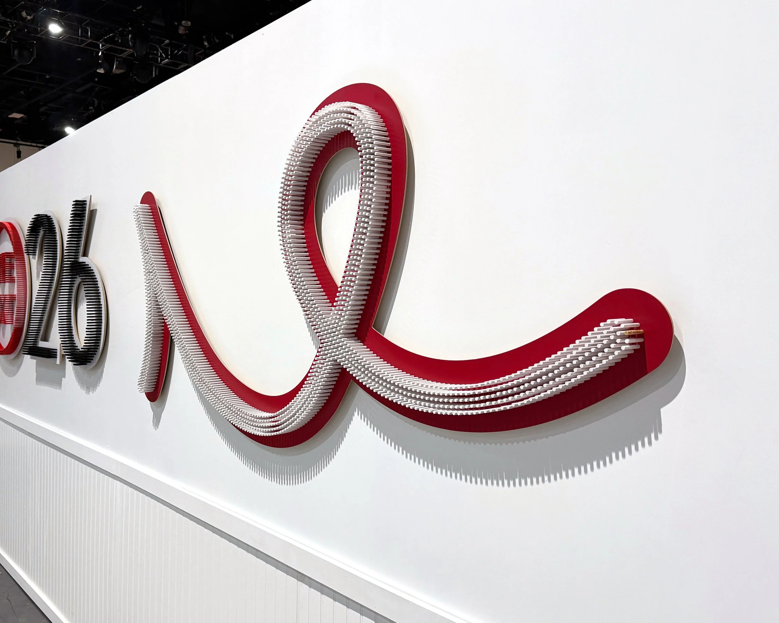 The exhibition also introduces the red ribbon works that flank the Next 26 logo. Set against fields of white pegs, these forms establish a new visual element within the collection, adding contrast and movement while expanding the range of imagery and structure across the show.